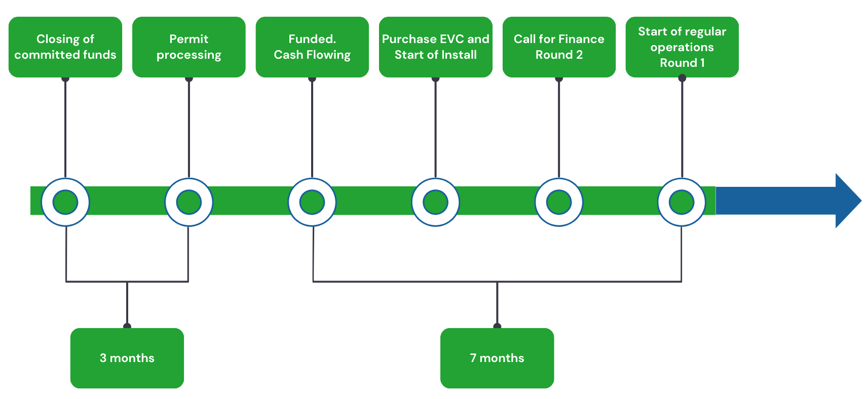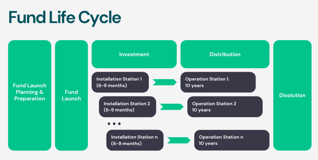 eMotion EV Infrastructure Fund I targets the acquisition and operation of EV charging assets over a 10–12 year fund life, balancing early deployment with long-term operating value.